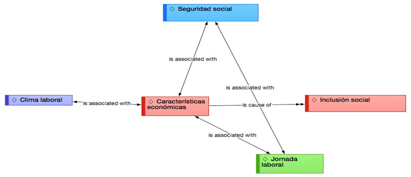Del mismo modo en la Figura 3, se aprecia la red conceptual de los factores que intervienen en las posibilidades laborales de los adultos mayores para tener una inclusión social y calidad de vida, en donde el estrato del sujeto de estudio enfatizó la necesidad de buscar el sentido de pertenencia. Dichos factores se resumen en jornada laboral, seguridad social, educación, clima laboral y motivación que se asocian con la variable características económicas; es decir que los adultos mayores lograrán plenamente su etapa de envejecimiento en función de los factores mencionados y de esta forma lograrán un bienestar social que se asocia a una calidad de vida de manera subjetiva.